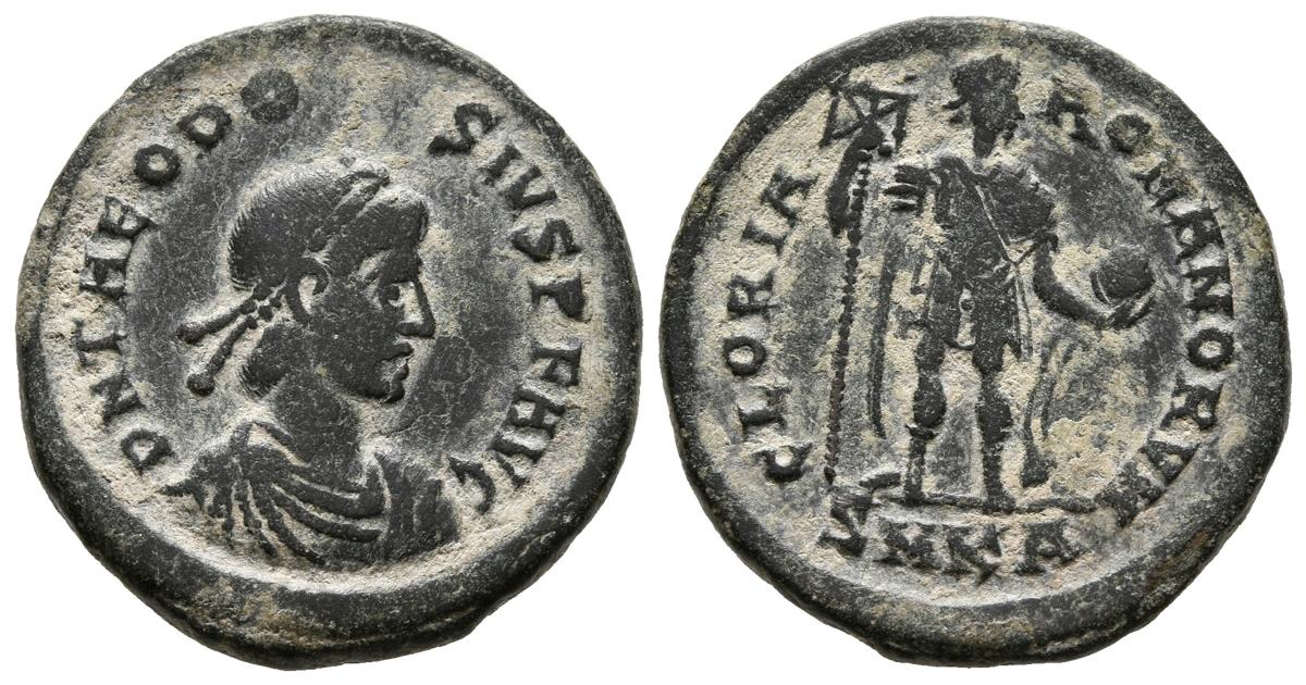 THEODOSIO I. Maiorina. (Ae. 4.66g / 21mm). 383-386 AD Cycicus. (ICR 14c). Anv: Diademic and draped bust of Theodosius I on the right, around legend: DN THEODOSIVS PF AVG. Rev: Teodosio I front standing carrying globe and banner, in exergue: SMKA, around legend: GLORIA ROMANORVM. Almost Very Fine.