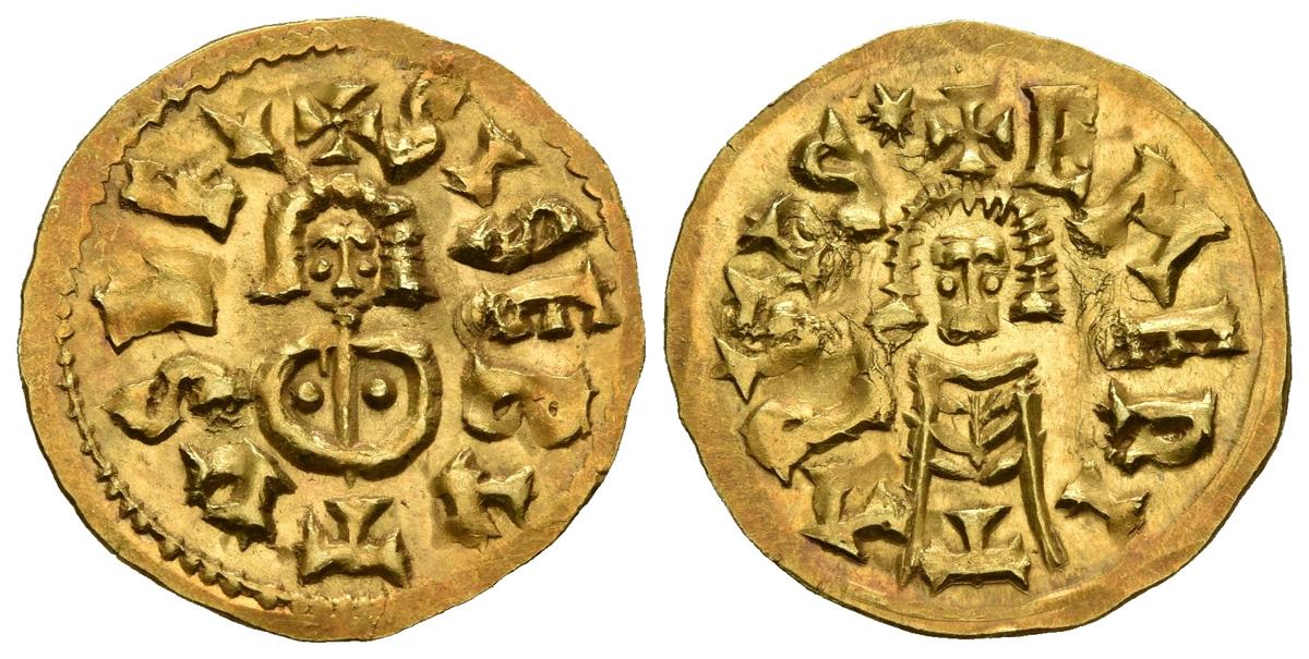 SISEBUTO (612-621). Tremissis. (Au. 1.49g / 19mm). Emerita (Merida). (CNV 258.10). Anv: Front bust, around legend: SISEBVTVS REX. Rev: Front bust, around legend: EMERITA PIVS. Good Extremely Fine. Reverse minting defect.