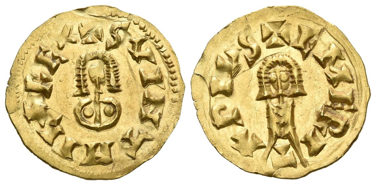 SUINTHILA (621-631). Triente. (Au. 1.44g / 19mm). Emerita (Merida). (CNV 327; R. Pliego 393a). Anv: Front bust, around legend: SVINTHILA REX. Rev: Front bust, around legend: EMERITA PIVS. Good Very Fine.