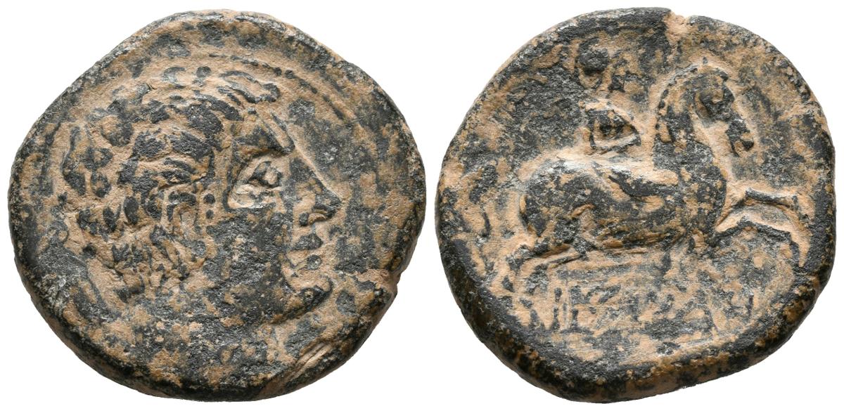 English BAITOLO (Badalona, Barcelona). As. (Ae. 12.35g / 27mm). 50 BC (FAB-190). Anv: Male head to the right, behind, rudder? Rev: Rider with palm to the right, below Iberian legend: BAITOLO. Almost Very Fine. Scarce