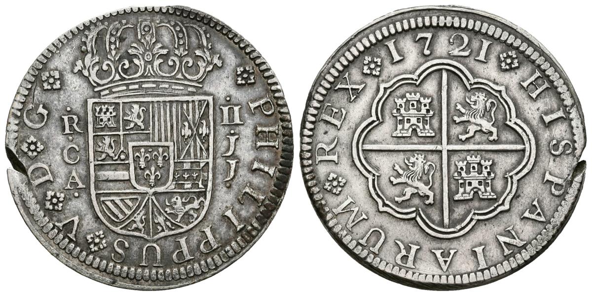Felipe V (1700-1746). 2 reais (Ar. 6.16g / 28mm). 1721. Cuenca JJ. (Cal-2019-671). Good Very Fine. Edge minting error.