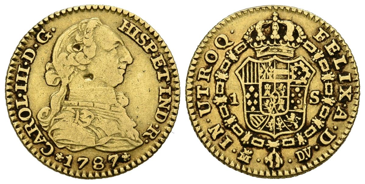 CARLOS III (1759-1788). 1 Escudo. (Au 3.34g / 18mm). 1787. Madrid DV. (Cal-2019-1370var). Variant per point between DV. Almost Very Fine.