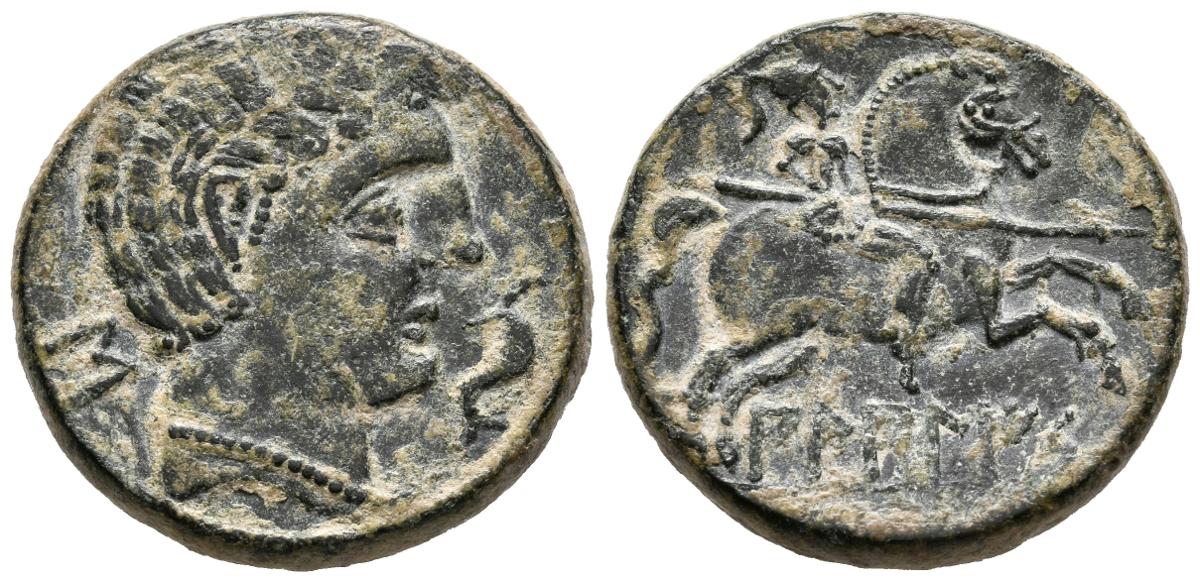 BILBILIS (Calatayud, Zaragoza). As. (Ae. 13.56g / 27mm). 120-30 BC (FAB-254). Anv: Male head to the right, behind the letter S, in front of the dolphin. Rev: Rider with spear to the right, below Iberian legend on line: BILBILIS. Good Very Fine.