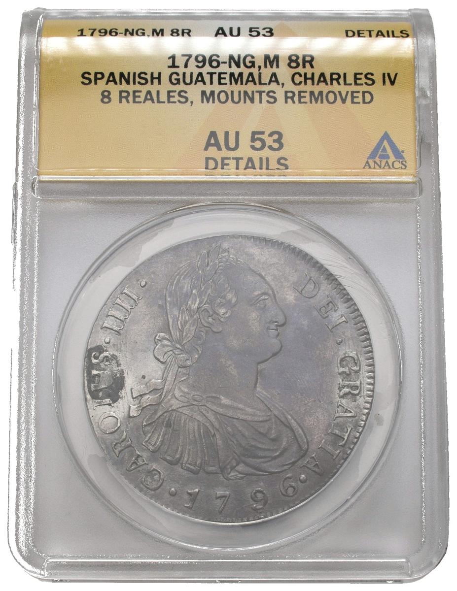 CARLOS IV (1788-1808). 8 Reales (Ar. 27.00g / 38mm) *. 1796. Nueva Guatemala M. (Cal-2019-888). AU 53 Details. Crimp removed. Beautiful patina. Encapsulated by ANACS.