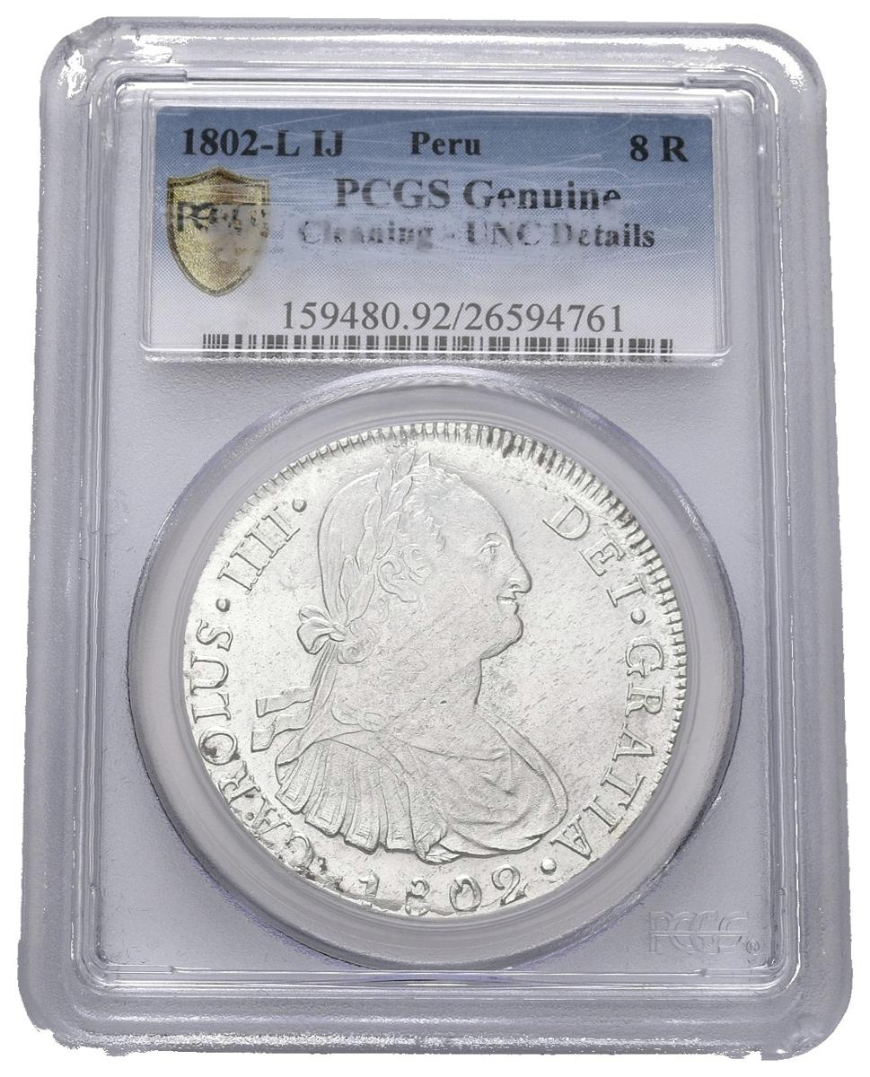 CARLOS IV (1788-1808). 8 Reales (Ar. 27.00g / 38mm) *. 1802. Lima IJ. (Cal-2019-765). UNC DETAILS. Cleaned. Encapsulated by PCGS. * Theoretical weight and measurement.