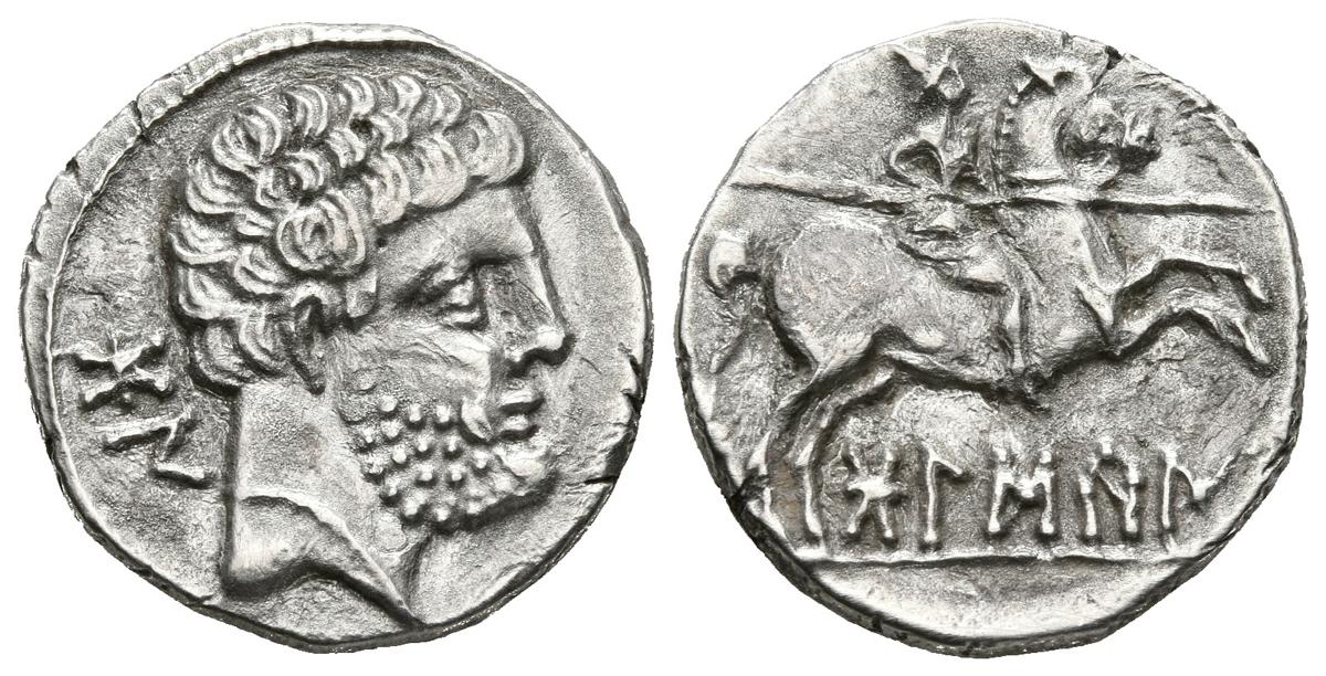 English BOLSCAN (Huesca). Denarius. (Ar. 3.09g / 17mm). 180-20 BC (FAB-1912, Type "Palenzuela"). Anv: Male head bearded to the right, behind Iberian letters: BoN. Rev: Rider with spear to the right, below Iberian legend: BoLSCaN. Extremely Fine. Nice specimen.