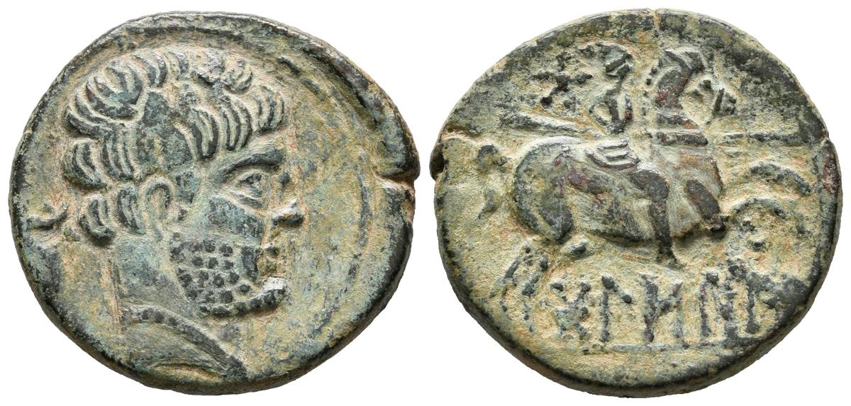 BOLSCAN (Huesca). As. (Ae. 8.09g / 24mm). 180-20 BC (FAB-1918). Anv: Bearded male head to the right, behind dolphin. Rev: Rider with spear to the right, above star, below Iberian legend: BoLSCaN. Good Very Fine.