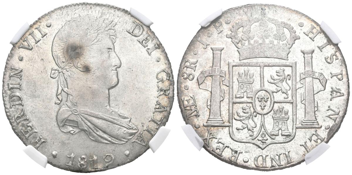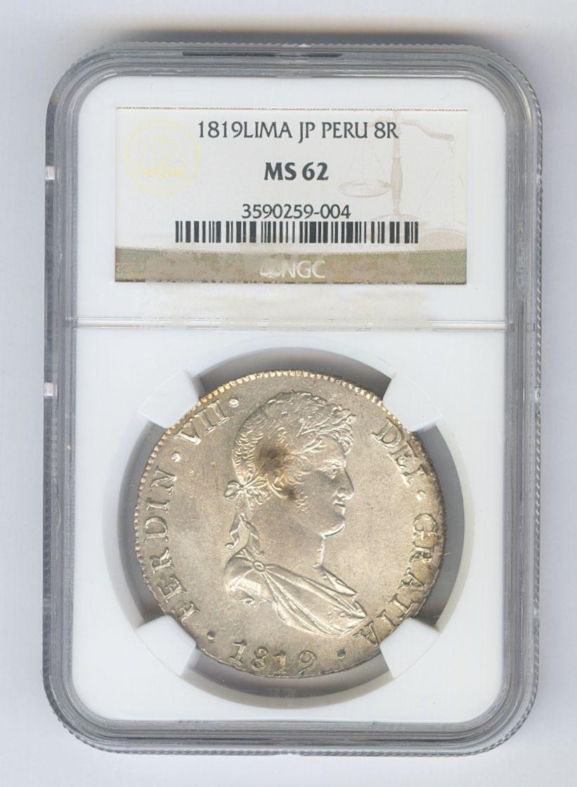 FERNANDO VII (1808-1833). 8 Reales (Ar. 27.00g / 38mm) *. 1819. Lima JP. (Cal-2019-1252). MS 62. Encapsulated by NGC. * Theoretical weight and measurement.