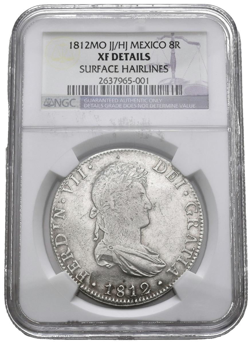 English FERNANDO VII (1808-1833). 8 Reales (Ar. 27.00g / 38mm) *. 1812. Mexico HJ / JJ. (Cal-2019-1321). XF DETAILS. Scratch . Encapsulated by NGC. * Theoretical weight and measurement.