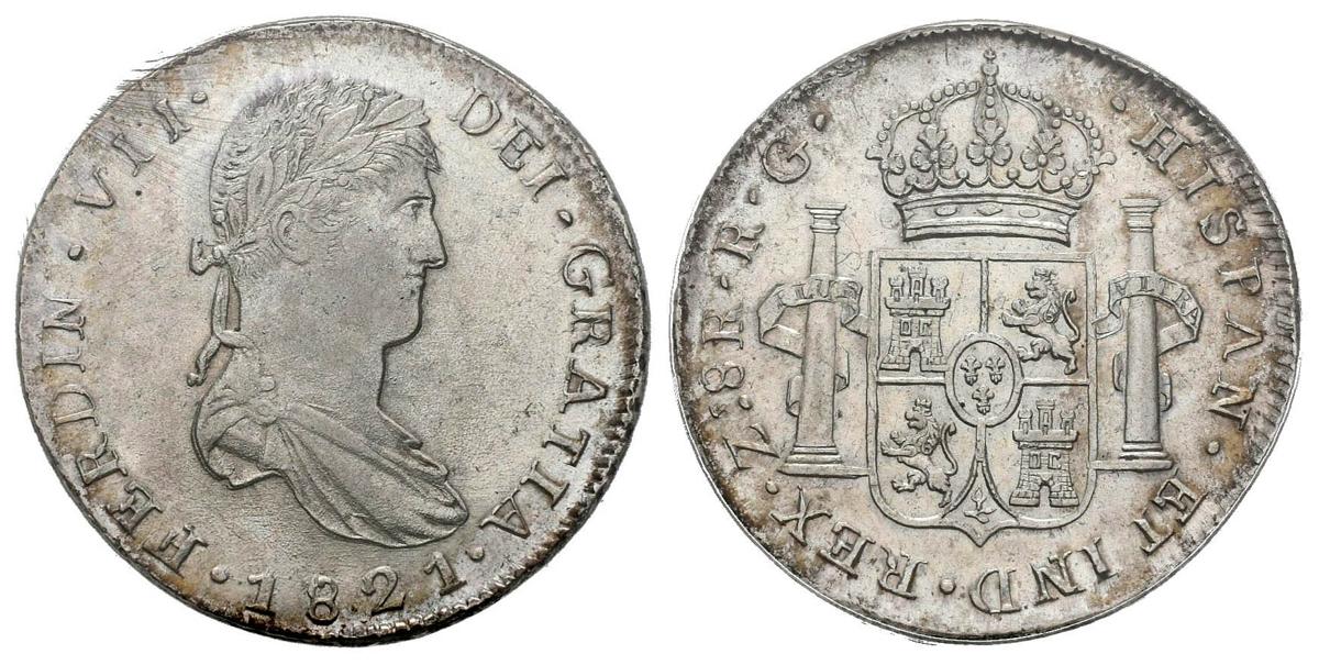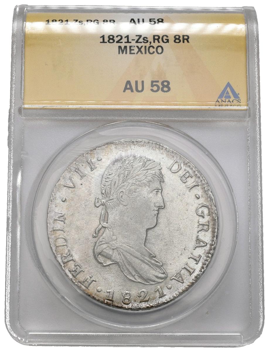 FERNANDO VII (1808-1833). 8 Reales (Ar. 27.00g / 38mm) *. 1821. Zacatecas RG. Second own bust. (Cal-2019-1465). AU 58. Encapsulated by ANACS. * Theoretical weight and measurement.