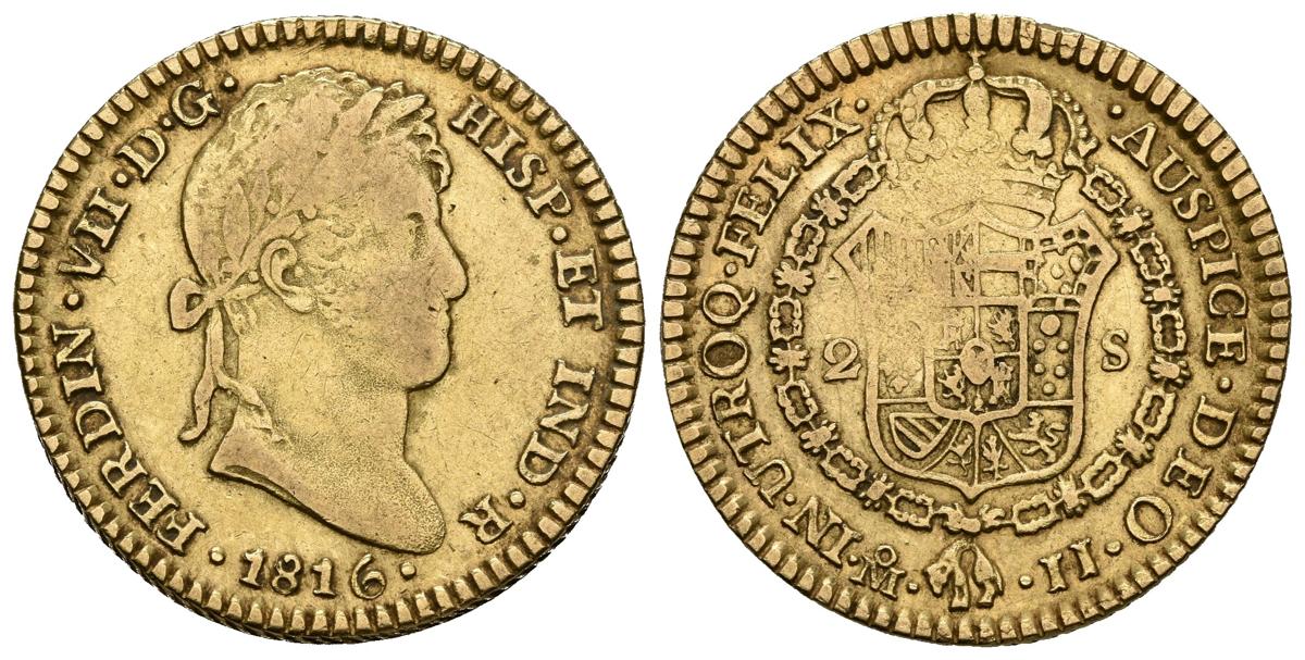 FERNANDO VII (1808-1833). 2 Escudos. (Au 6.72g / 23mm). 1816. Mexico JJ. (Cal-2019-1645). Almost Very Fine. Very scarce. Coinage voids.