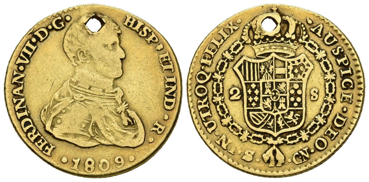 English FERNANDO VII (1808-1833). 2 Escudos (Au. 5.67g / 23mm). 1809. Sevilla CN. (Cal-2019-1667). First bust. Almost Very Fine. Hole at 12 o'clock. Used as a jewel.