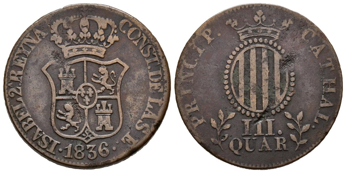 ISABEL II (1833-1868). 3 Cuartos. (Ae. 7.24g / 26mm). 1836. Barcelona. (Cal-2019-1). Legend: CATHAL and III QUAR. Almost Very Fine. Cleaned oxidations. Very rare.