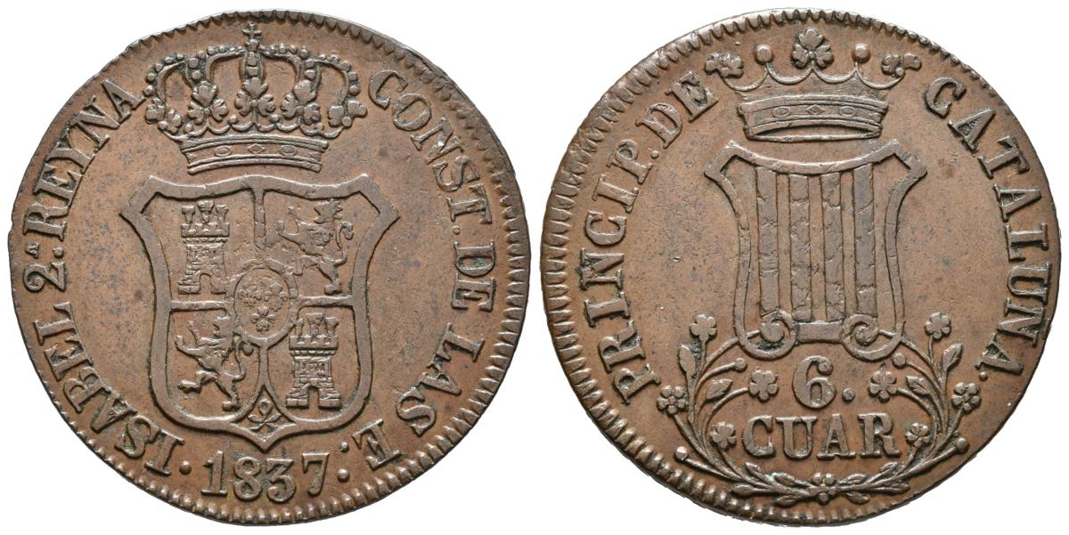 ISABEL II (1833-1868). 6 Cuartos. (Ae. 13.03g / 33mm). 1837. Barcelona. (Cal-2019-17). Very Fine.