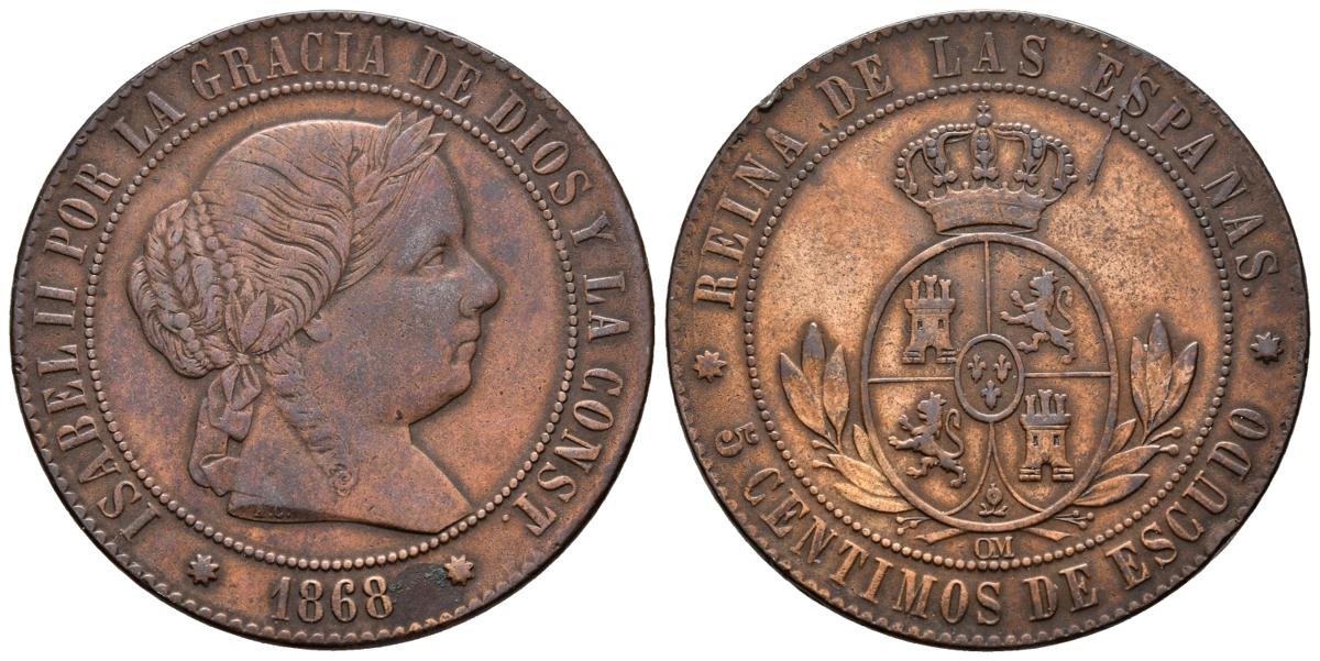 ISABEL II (1833-1868). 5 Céntimos de Escudo (Ae. 12,71g / 32mm). 1868. Barcelona OM. (Cal-2019-246). Extremely Fine. Beautiful patina.