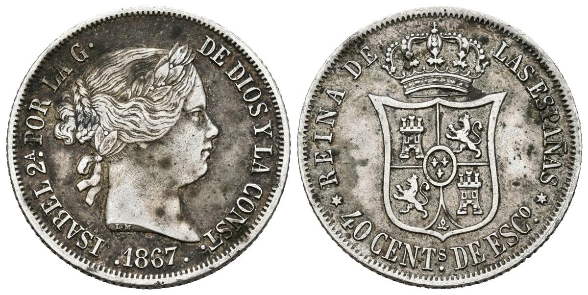 ISABEL II (1833-1868). 40 Céntimos de Escudo. (Ar. 5.18g / 23mm). 1867. Madrid. (Cal-2019-502). Very Fine. Dark patina.