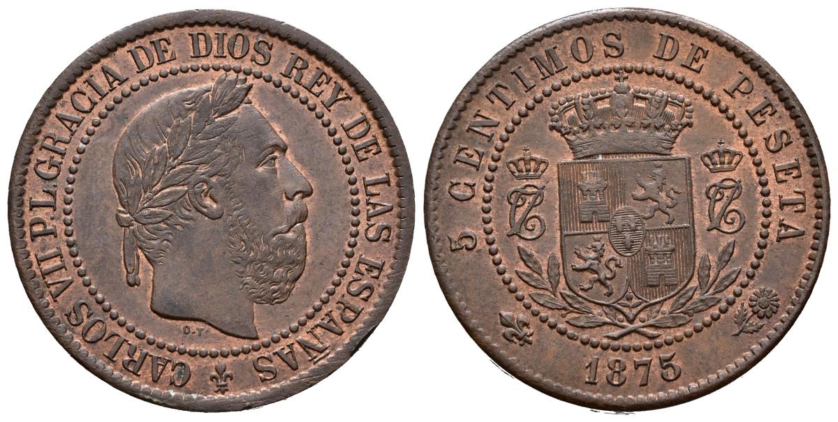 CARLOS VII, the Pretender (1868-1905). 5 Peseta Cents. (Ae. 5.06g / 25mm). 1875. Brussels. (Cal-2019-2). Extremely Fine. Remnants of original shine.