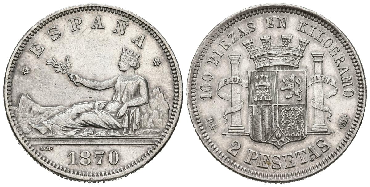 English PROVISIONAL GOVERNMENT (1868-1871). 2 Pesetas (Ar. 10.02g / 27mm). 1870 * 18-73. Madrid DEM. (Cal-2019-28). Almost Extremely Fine/ Good Very Fine. Cleaned.