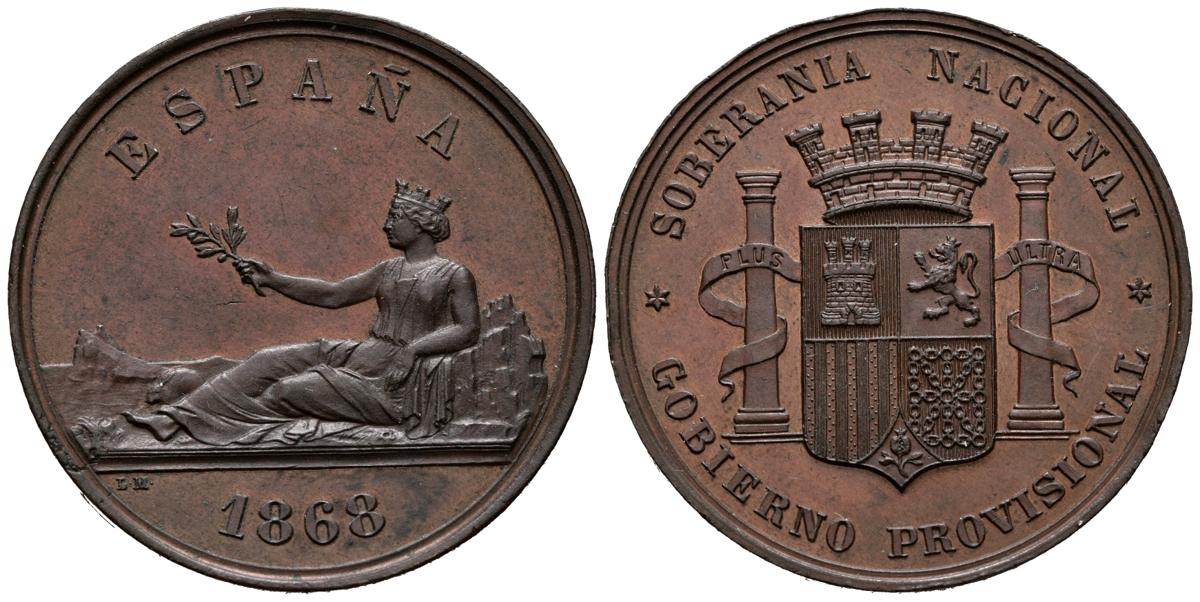 PROVISIONAL GOVERNMENT (1868-1871). National Sovereignty (Ae. 24.63g / 37mm). 1868. Madrid. Engraver: Luis Marchioni. (Cal-2019-35). It served as a test to make the 5 Pesetas of 1869. Almost Uncirculated.