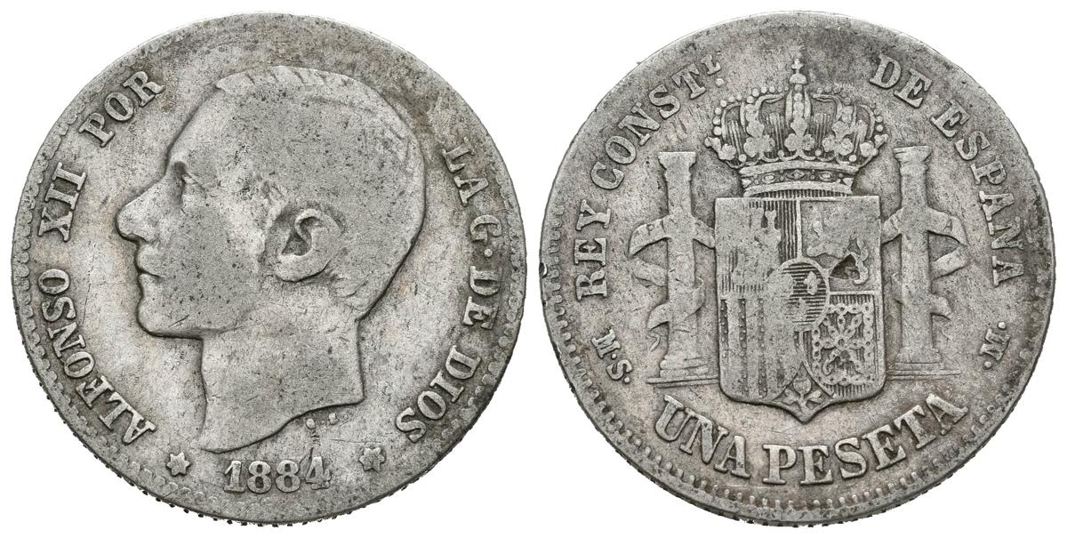 ALFONSO XII (1874-1885). 1 peseta. (Ar. 4.80g / 23mm). 1884 * 18-84. Madrid MSM. (Cal-2019-23). Good Fine. Stars not visible. Limited.