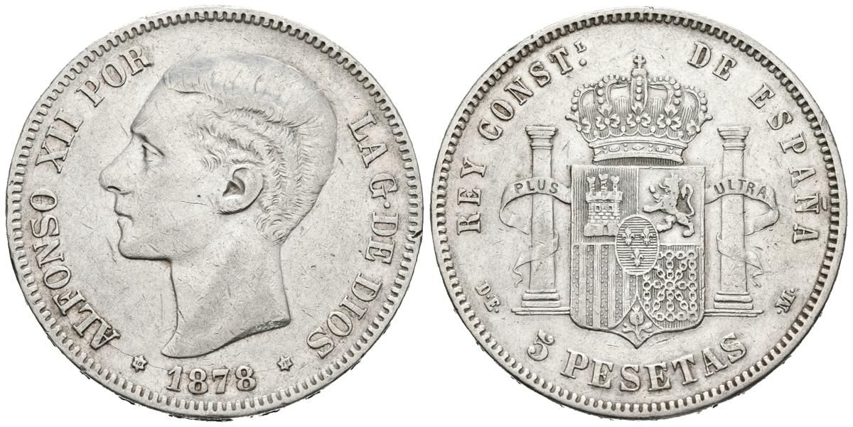 English ALFONSO XII (1874-1885). 5 Pesetas. (Ar. 24.86g / 37mm). 1878 * 18-78. Madrid DEM. (Cal-2019-39). Very Fine.