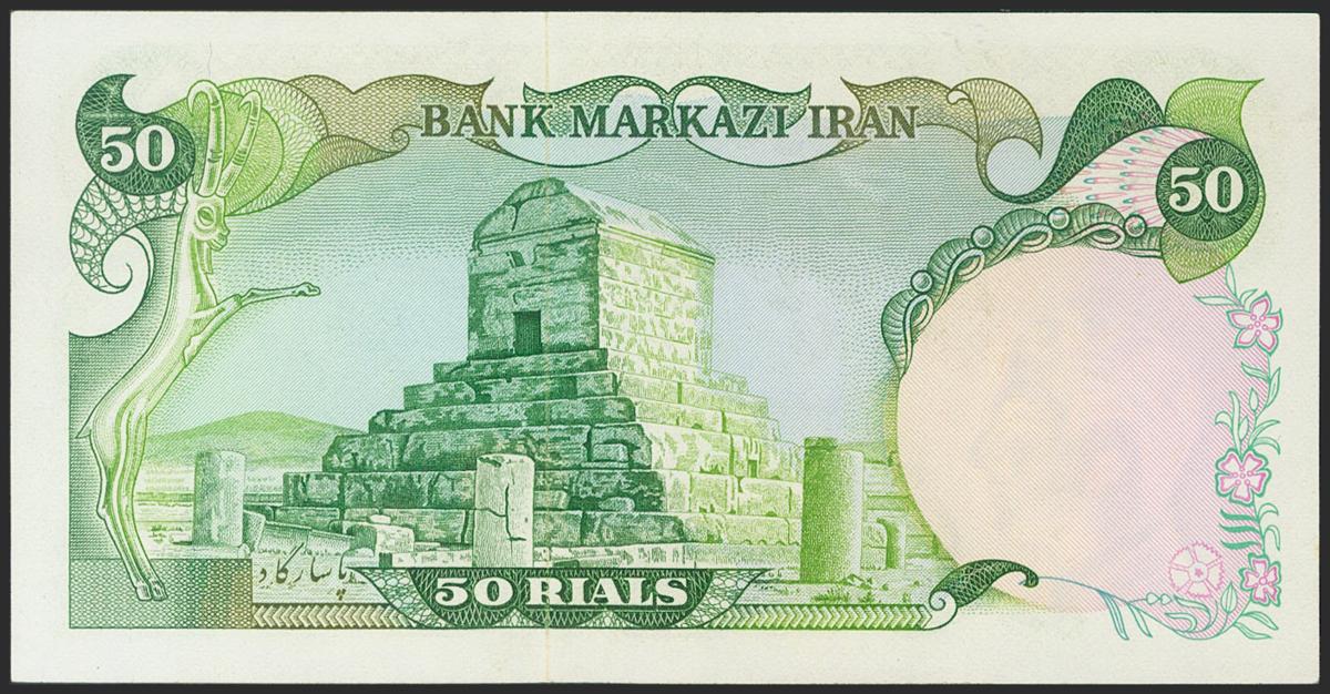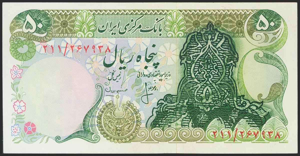 IRAN. 50 Rials. ND. Islamic Republic provisional issues. Signatures: Mehran and Ansary. Type 1. Portrait overprint B on 101c. (Pick: 111a). Uncirculated.