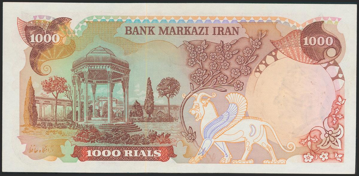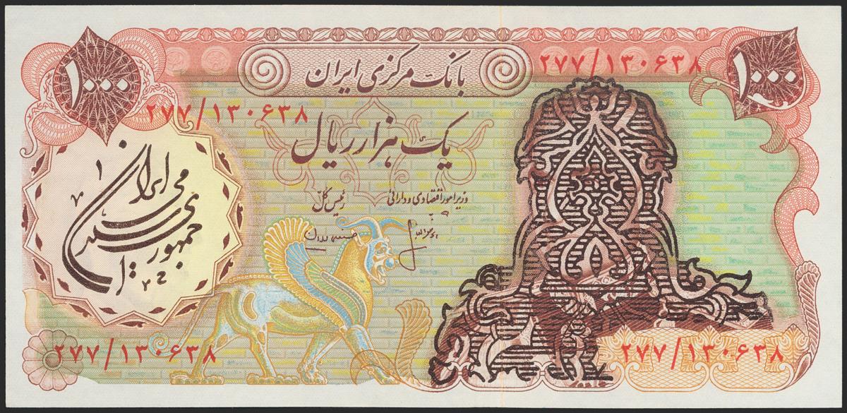 IRAN. 1000 Rials. (Don't date). Islamic Republic provisional issues. Signatures: Mehran and Ansary, type 3 and portrait overprint G on 105b. (Pick: 125a). Uncirculated.