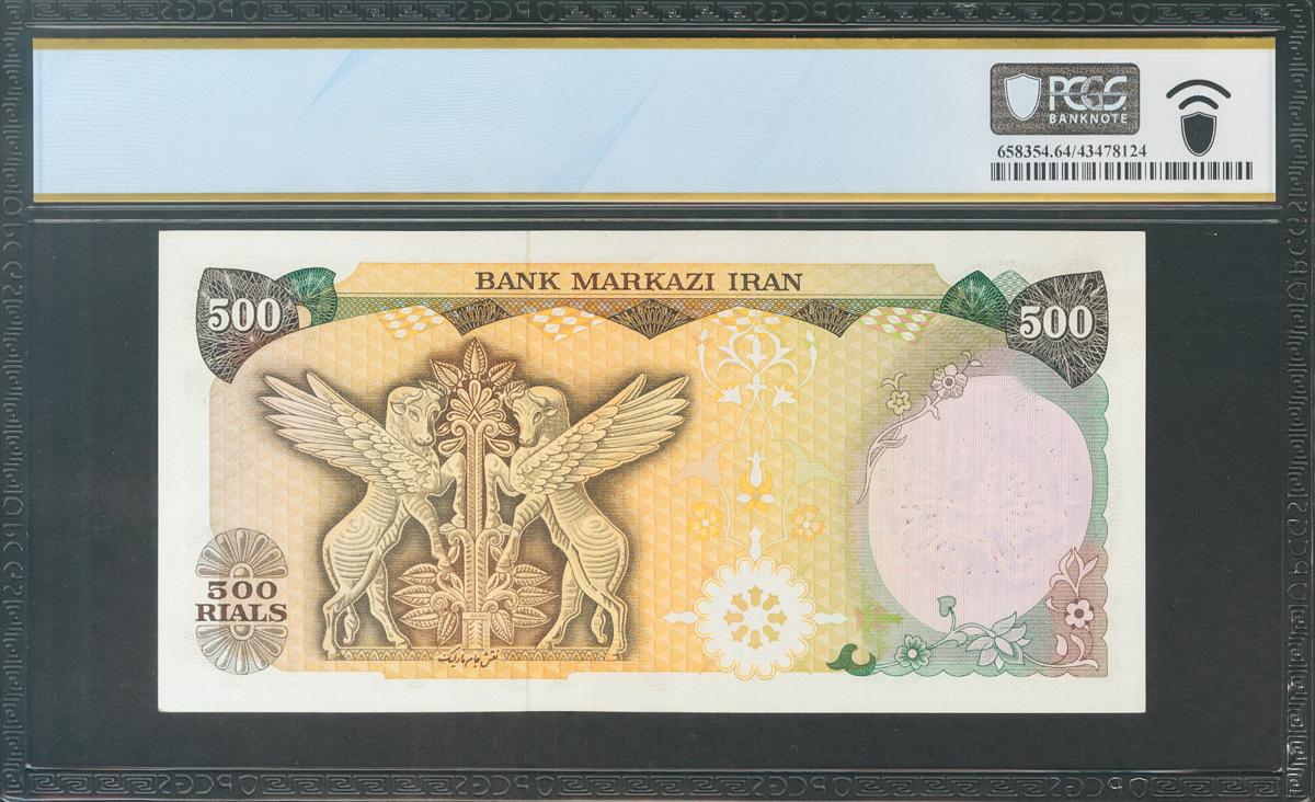 IRAN. 500 Rials. 1981. Islamic Republic. PRINTING ERROR, missing overprint on the reverse. (Pick: 128). Very rare. Choice Uncirculated. PCGS64PPQ.
