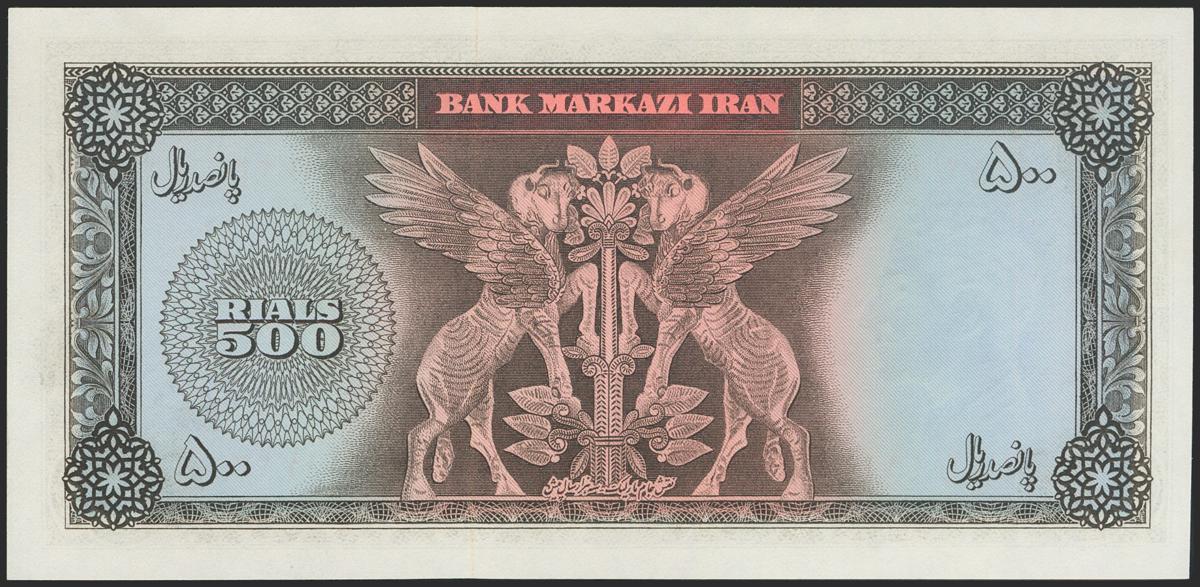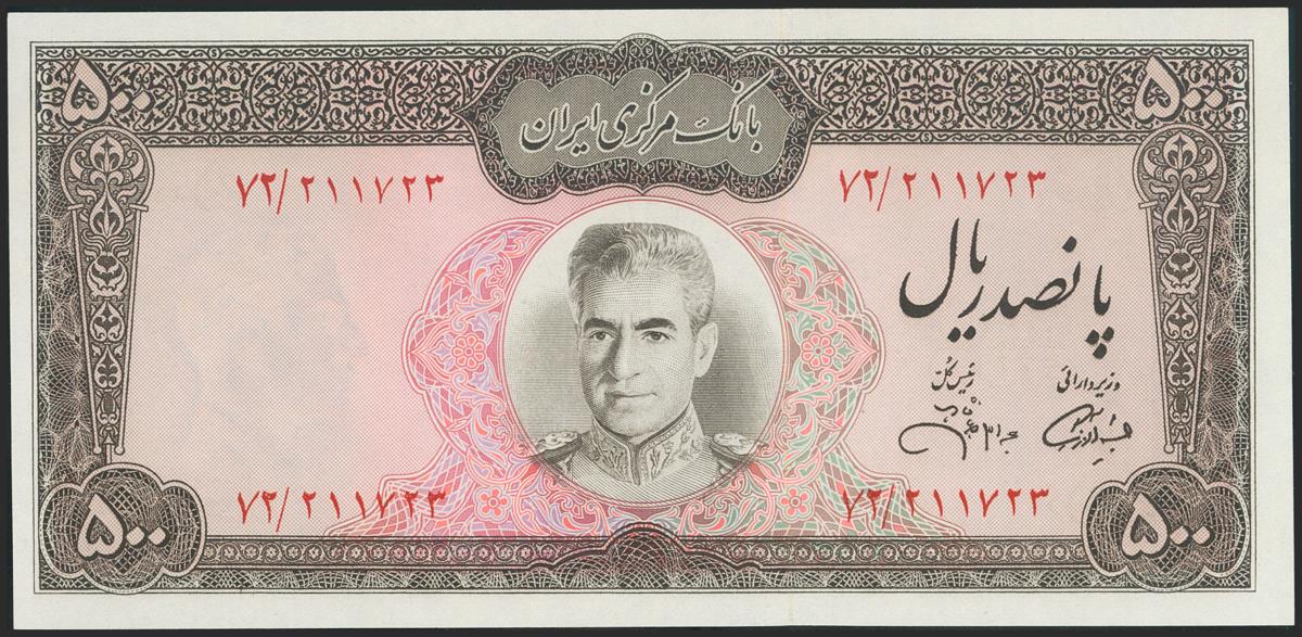 IRAN. 500 Rials. (1971ca). National Bank. Signatures: Jahanshahi and Amouzegar, light panel. (Pick: 93c). Uncirculated.