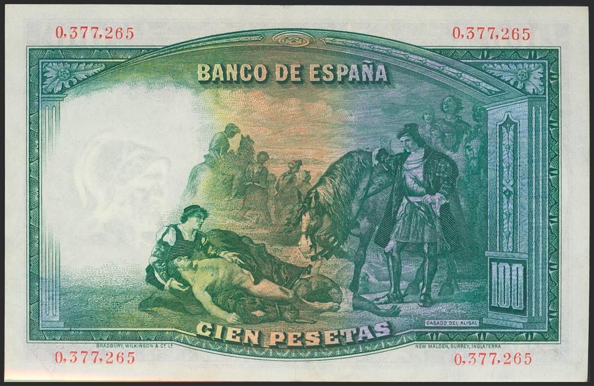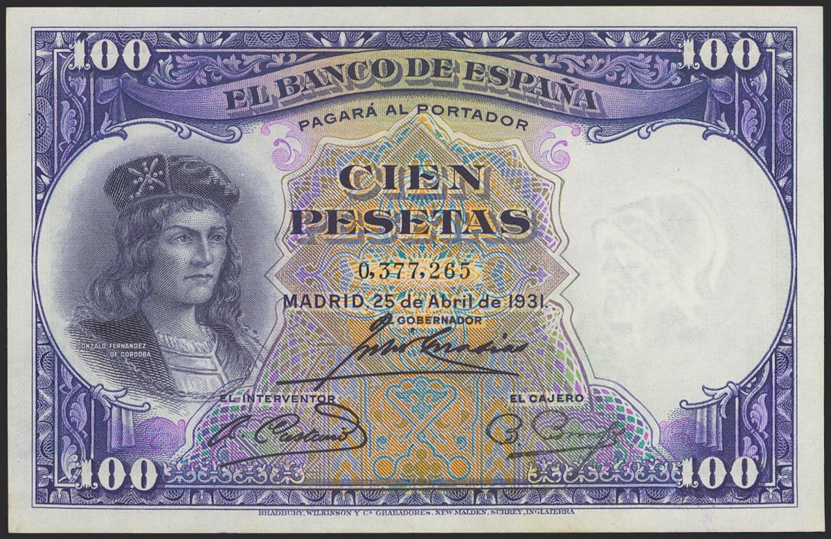 100 pesetas. April 25, 1931. Without series. (Edifil 2021: 360). Original sizing. Good Extremely Fine.