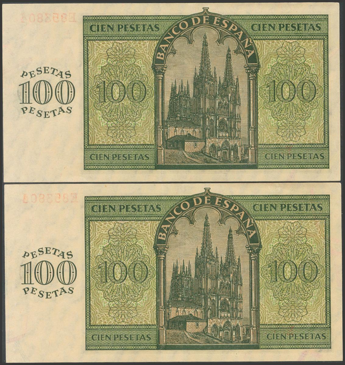 100 pesetas. November 21, 1936. Correlative pair. Series E. (Edifil 2017: 421a). Original sizing, slight waviness without breaking fiber. Good Extremely Fine.