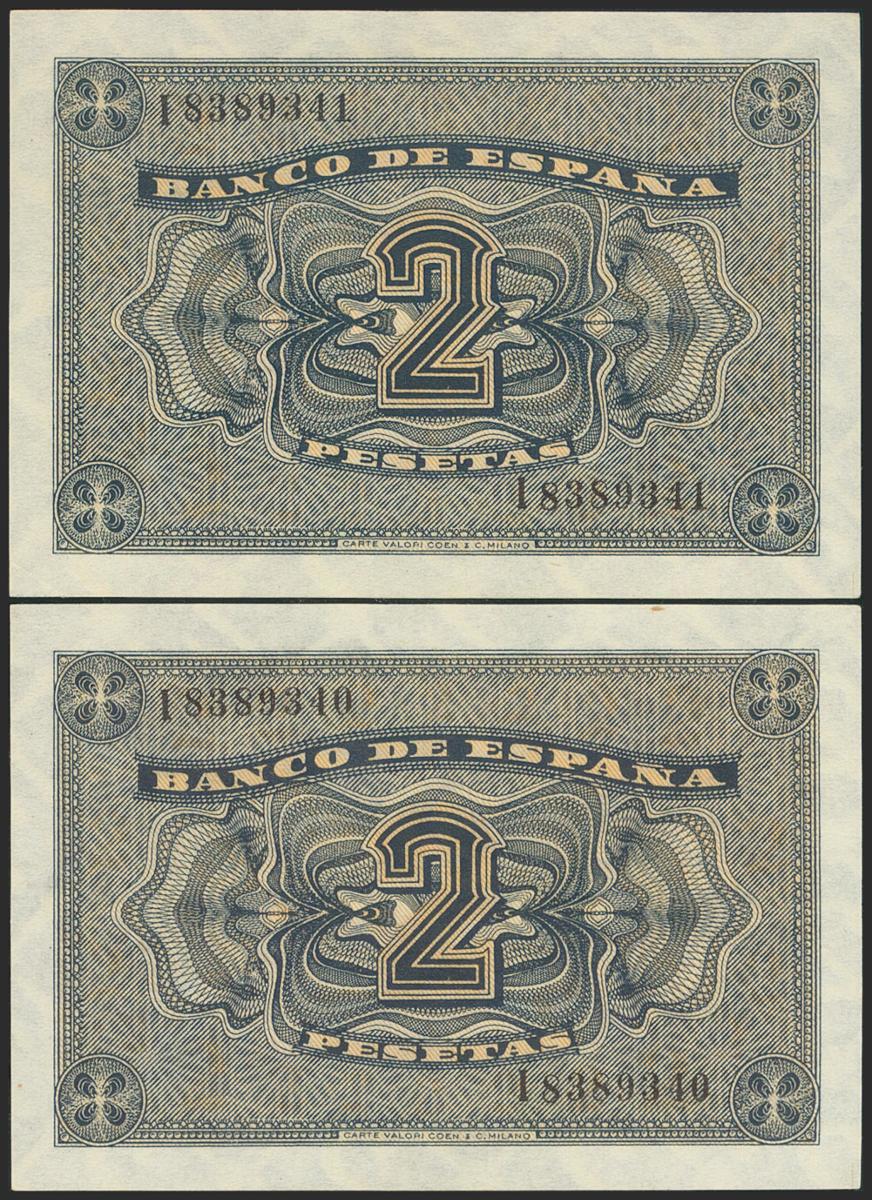 2 Pesetas. April 30, 1938. Correlative pair. Series F. (Edifil 2021: 429a). Original sizing. Uncirculated.