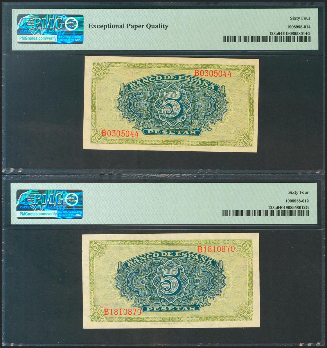 English 5 Pesetas. September 4, 1940. Correlative pair. Series B. (Edifil 2021: 443a, Pick: 123a). Unusual in this quality. Uncirculated. PMG64EPQ / 64 package.