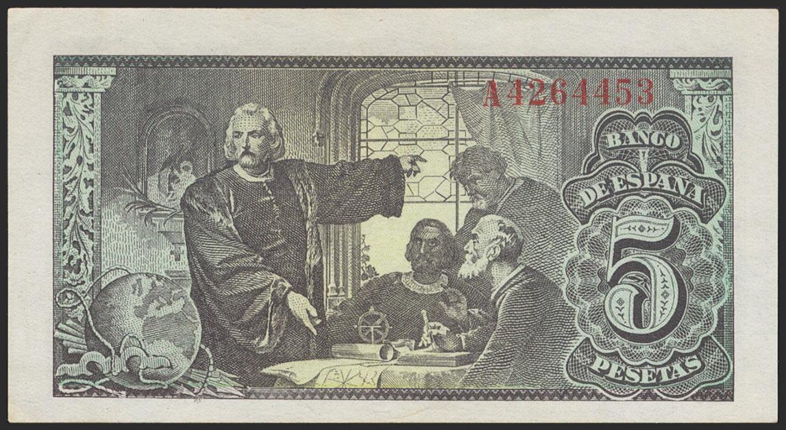 5 Pesetas. February 13, 1943. Series A. (Edifil 2021: 446a). Original sizing. Almost Uncirculated.