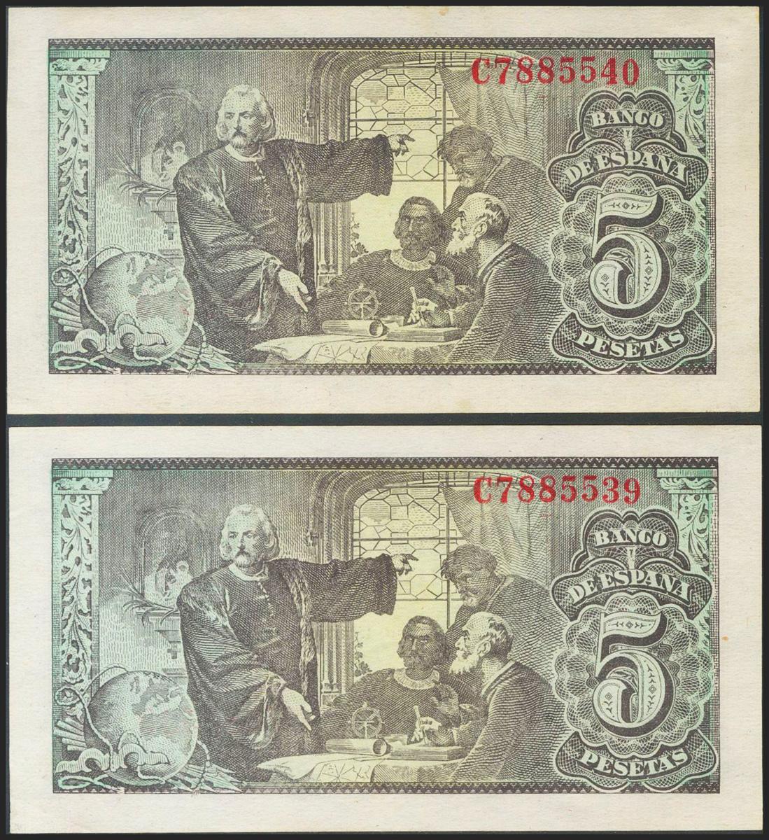 5 Pesetas. February 13, 1943. Correlative couple. Series C. (Edifil 2021: 446a). Original sizing. Good Extremely Fine.