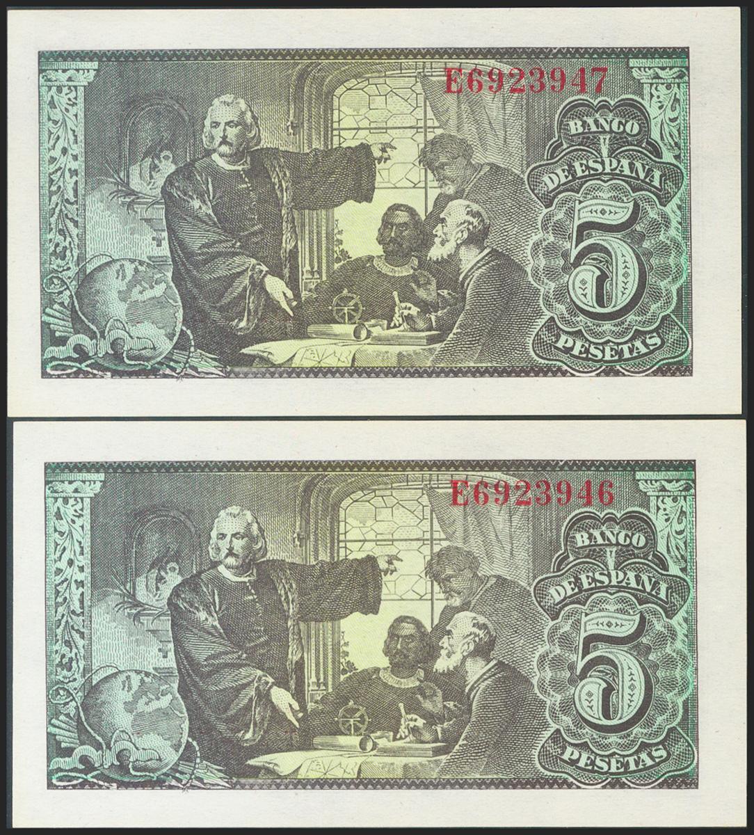 5 Pesetas. February 13, 1943. Correlative couple. Series E. (Edifil 2021: 446a). Original sizing. Uncirculated.