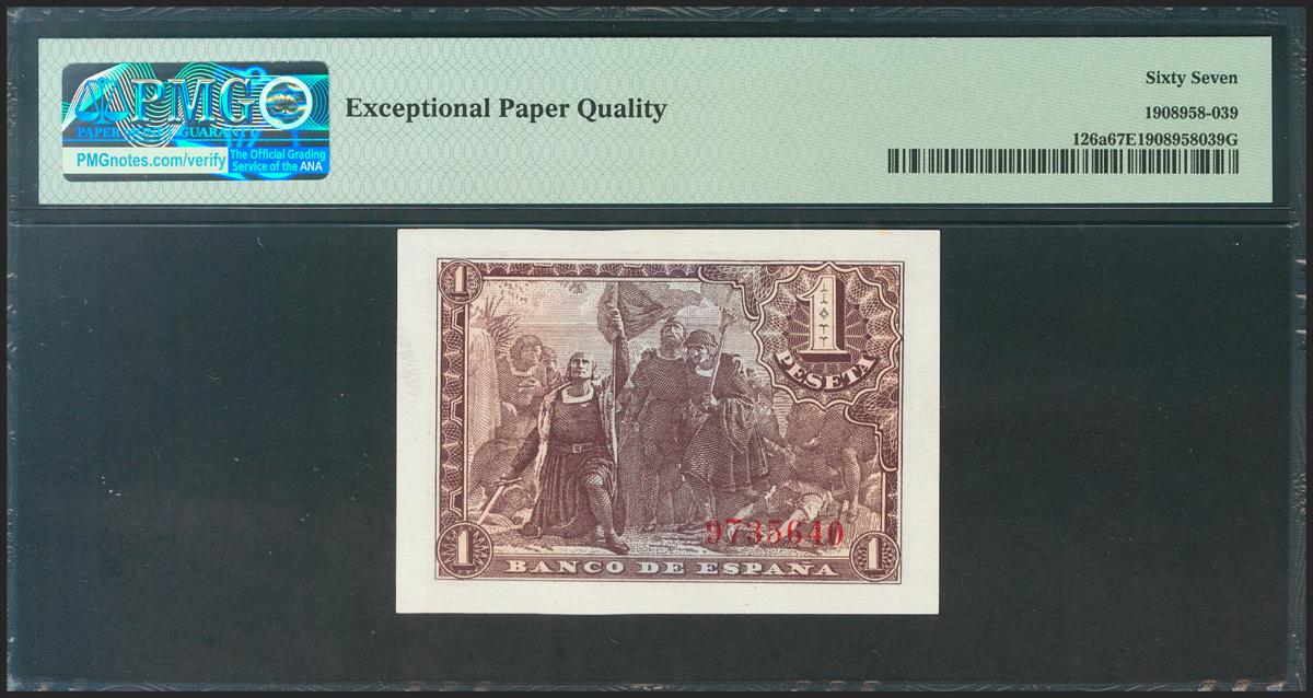 1 Pesetas. May 21, 1943. Without series. (Edifil 2021: 447, Pick: 126a). Rare in this quality, original sizing. Uncirculated. PMG67EPQ package.