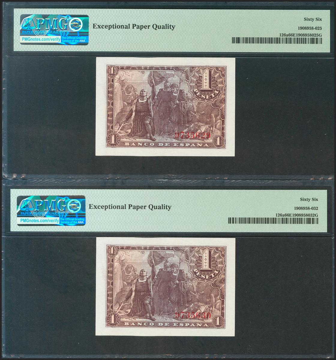 1 Pesetas. May 21, 1943. Correlative couple. No serie. (Edifil 2021: 447, Pick: 126a). Rare in this quality, original sizing. Uncirculated. PMG66EPQ package, both.