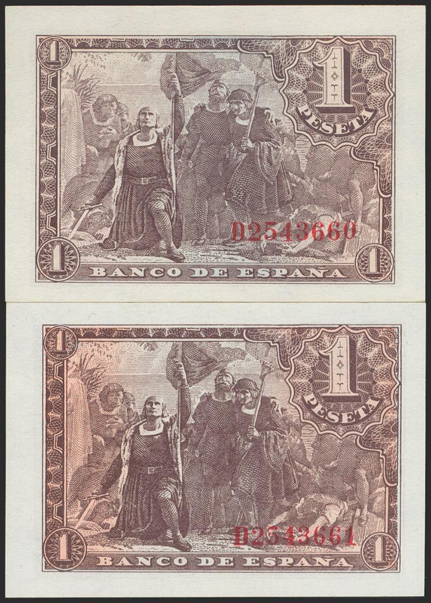 1 peseta. May 21, 1943. Correlative couple. Series D. (Edifil 2021: 447a). Original sizing. Uncirculated.