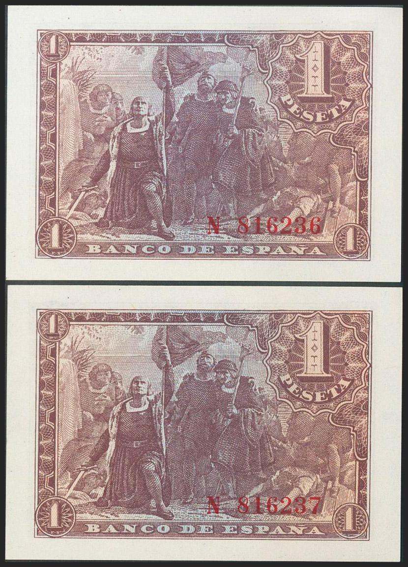 1 peseta. May 21, 1943. Correlative couple. Series N, last series issued. (Edifil 2021: 447a). It keeps all the original sizing. Uncirculated.