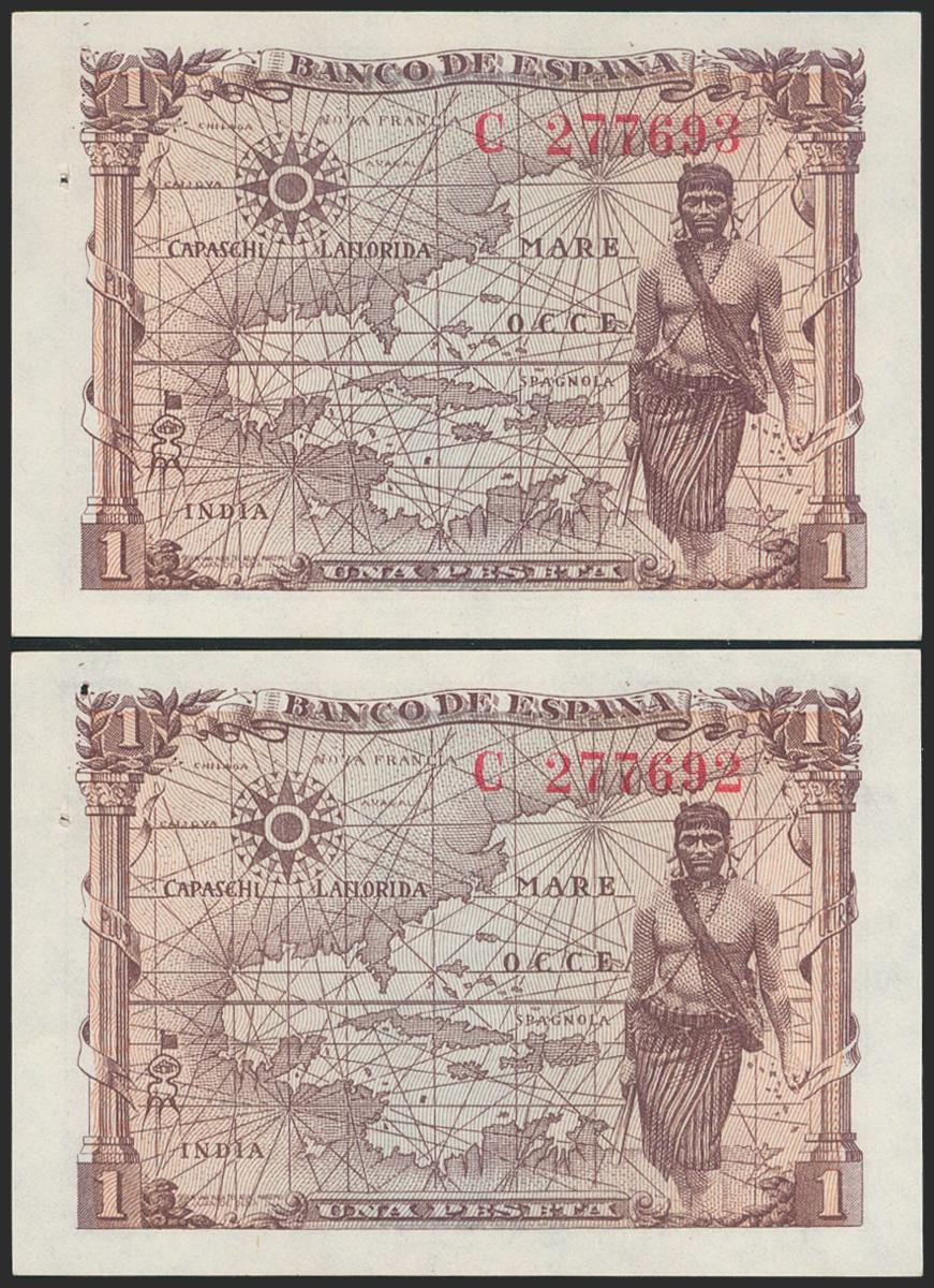 1 peseta. June 15, 1945. Correlative couple. Series C. (Edifil 2021: 448a). Original sizing and staple points. Good Extremely Fine.