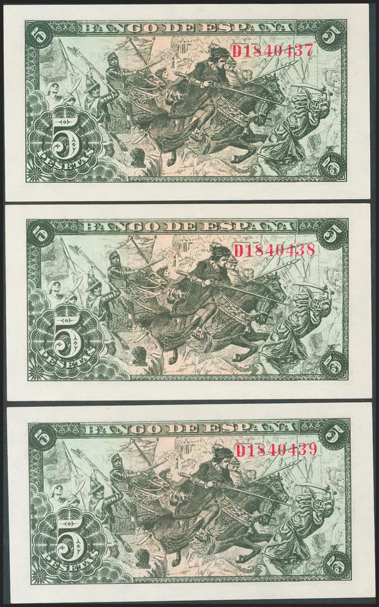 5 Pesetas. June 15, 1945. Correlative trio. Series D. (Edifil 2021: 449a). Original sizing. Uncirculated.