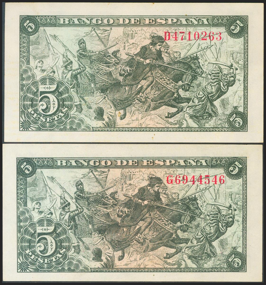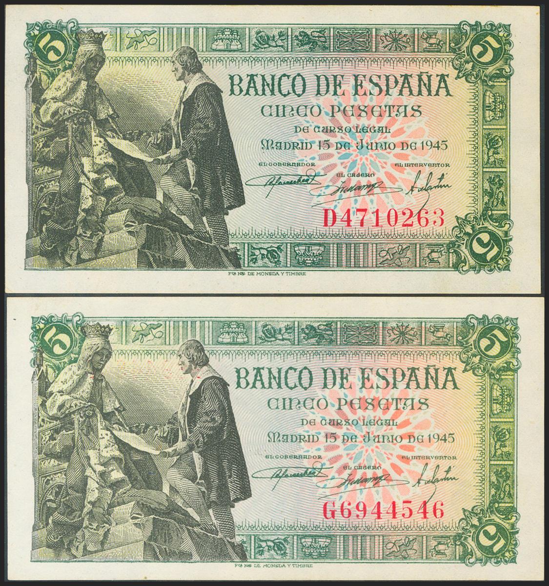 Set of 2 banknotes of 5 Pesetas issued on June 15, 1945 with series D and G, respectively (Edifil 2021: 449a), original size. Almost Uncirculated.