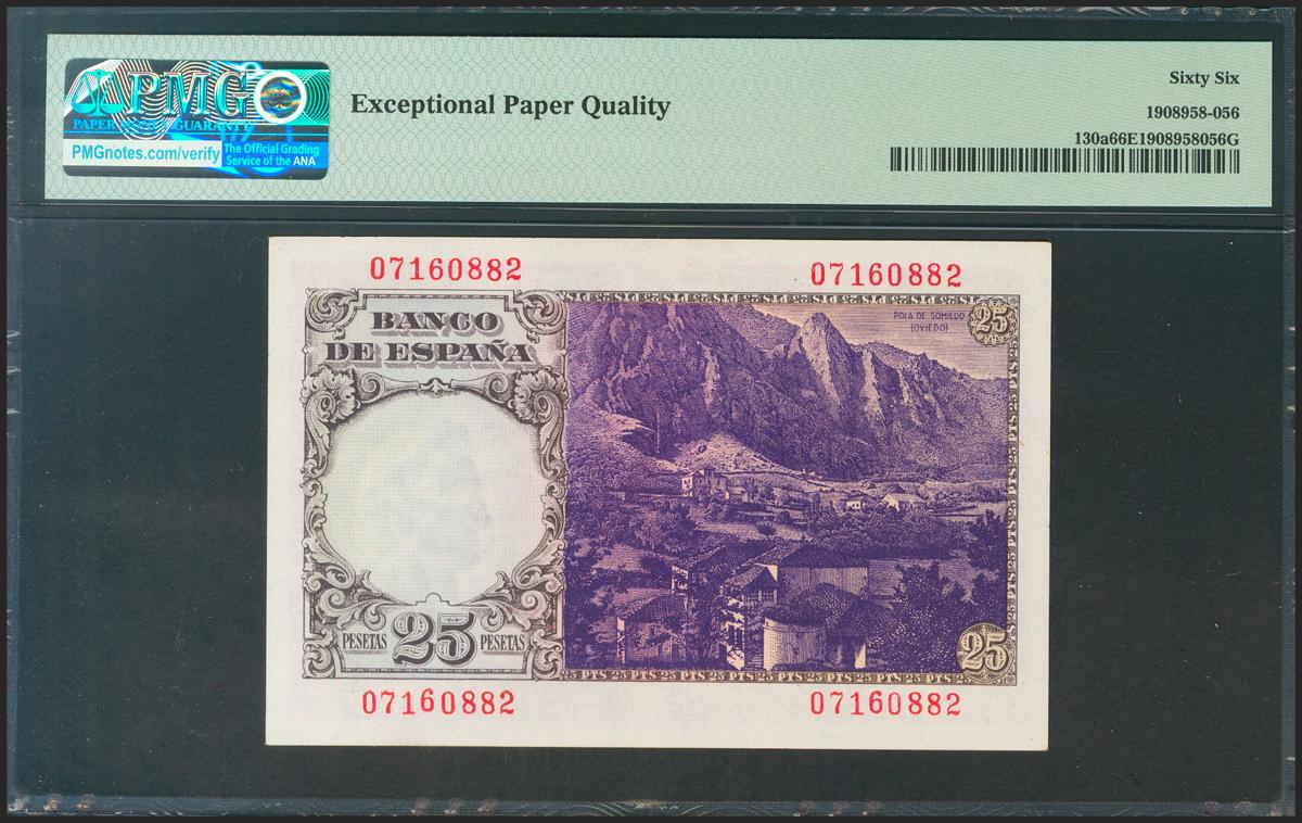 25 Pesetas. February 19, 1946. Without series. (Edifil 2021: 450, Pick: 130a). Very rare in this quality, original sizing. Uncirculated. Package PMG66EPQ.