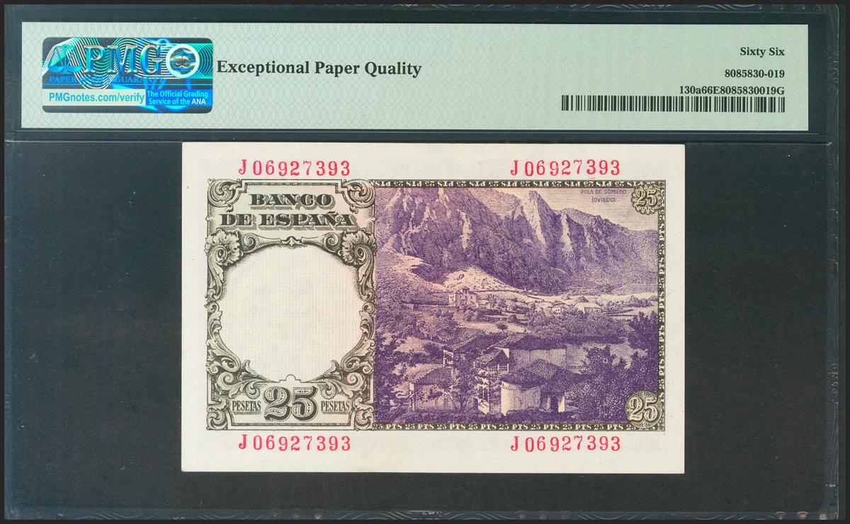 25 Pesetas. February 16, 1946. Series J. (Edifil 2021: 450a). Original sizing, rare like that. Uncirculated. Package PMG66EPQ.