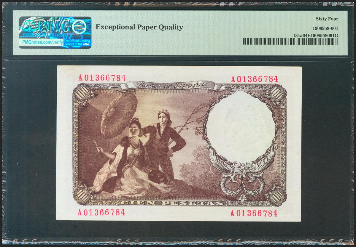 100 pesetas. February 19, 1946. Series A. (Edifil 2021: 451, Pick: 131a). Unusual in this quality, original sizing. Uncirculated. Package PMG64EPQ.