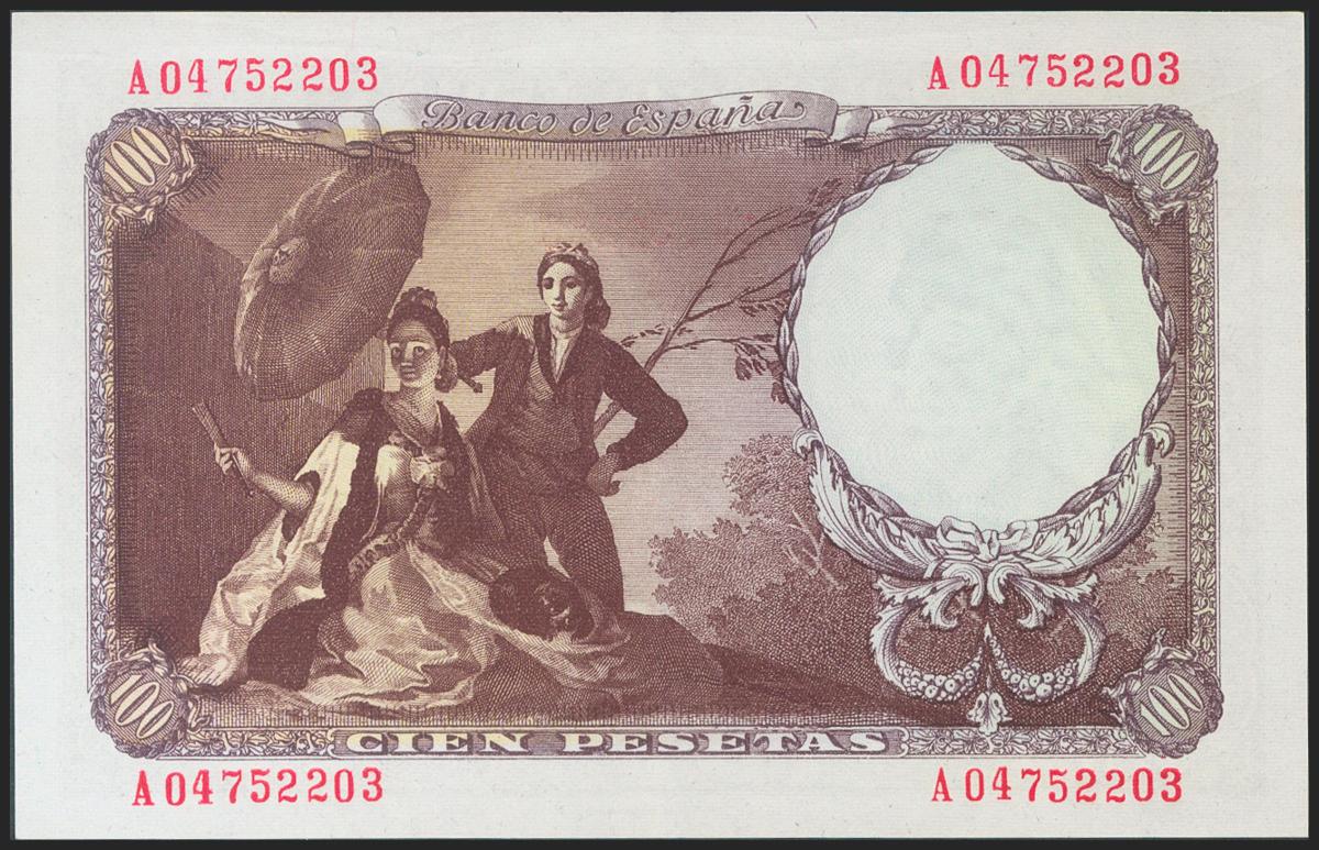 English 100 pesetas. February 19, 1946. Series A. (Edifil 2021: 451a). It retains much of the original size. Good Extremely Fine.