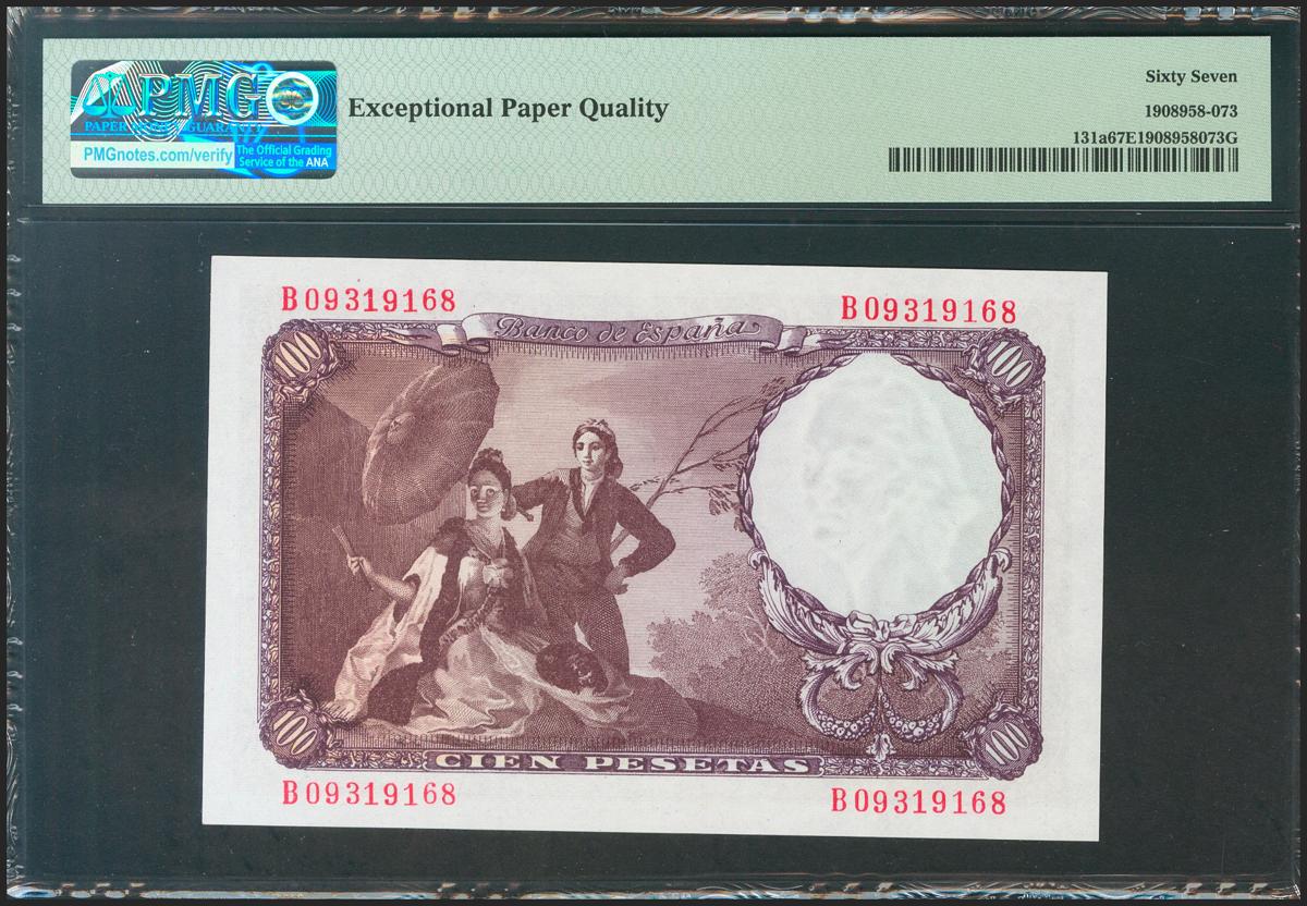 100 pesetas. February 19, 1946. Series B. (Edifil 2021: 451, Pick: 131a). Very rare in this quality, original sizing. Uncirculated. PMG67EPQ package.