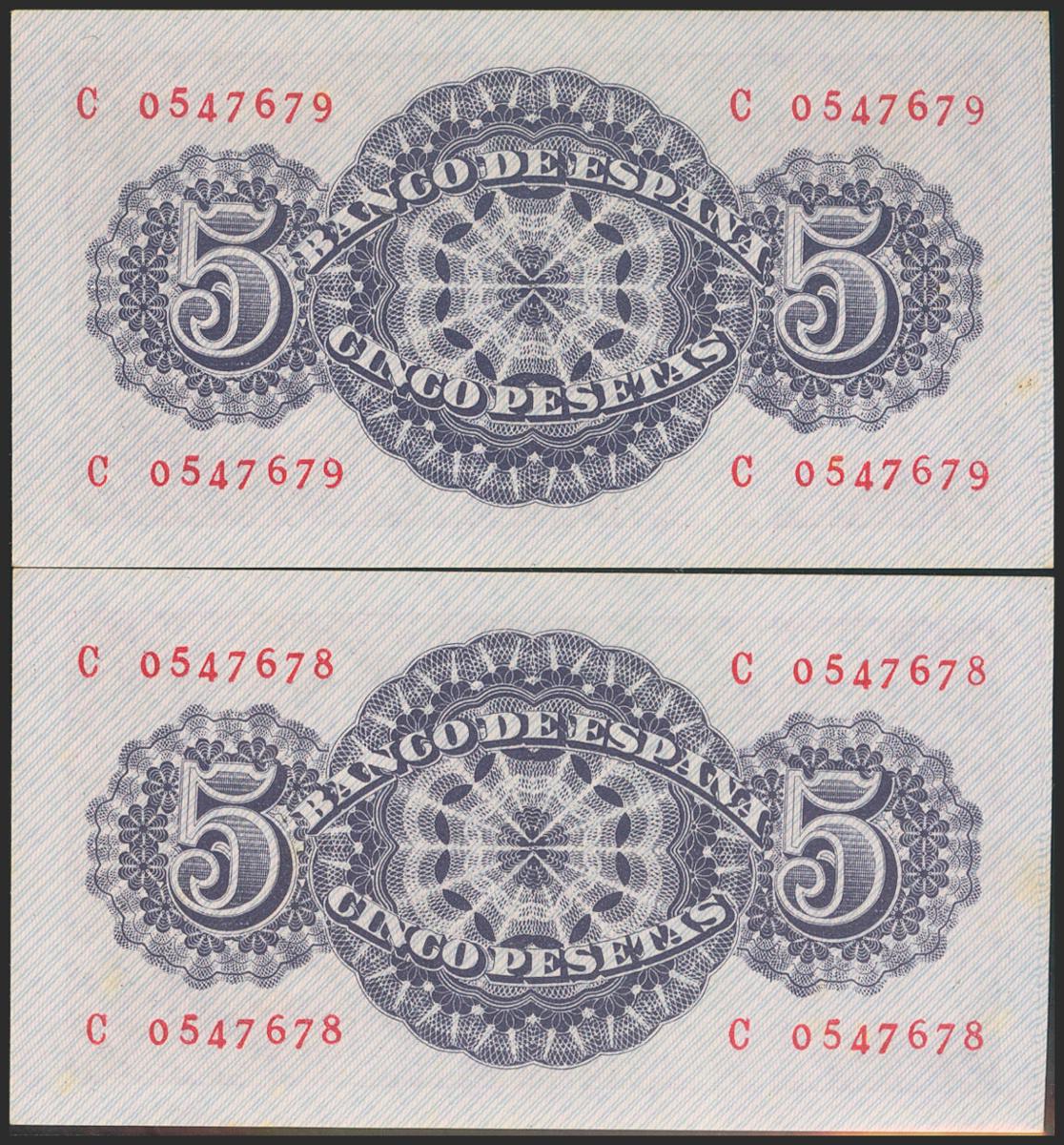 5 Pesetas. April 12, 1947. Correlative pair. Series C. (Edifil 2021: 454a). Original sizing. Almost Uncirculated.