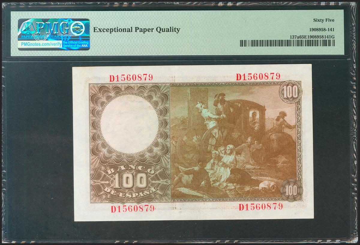 100 pesetas. May 2, 1948. Series D. (Edifil 2021: 456a, Pick: 137a). Rare in this quality, original sizing. Uncirculated. Packaged PMG65EPQ.